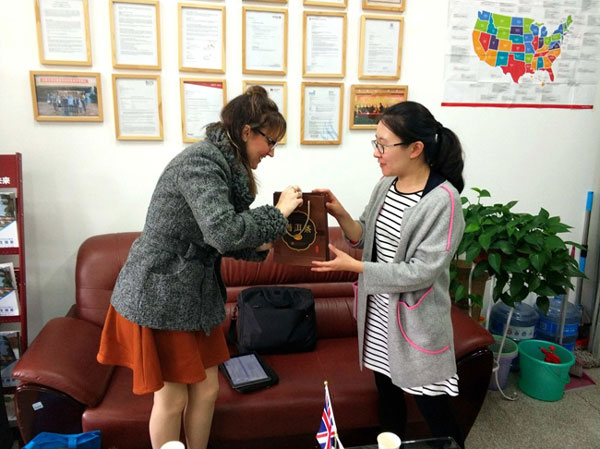 在我院出国留学培训基地办公室,Sarah老师和Gavin老师与李老师、王老师交流了往届、应届在读学生各方面情况以及未来进一步深化合作交换了意见,Sarah老师代表赫尔大学向我院颁发了赫尔大学优秀合作伙伴证书,同时李老师代表我院领导回赠礼物给Sarah老师和Gavin老师,在讲座正式开始前,Gavin老师还为基地办老师们介绍更新了赫尔大学的相关信息。