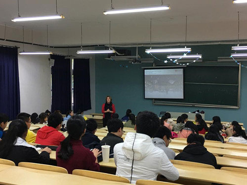 11月8日,英国密德萨斯大学学术英语部Nancy Wallace主任来我校为大一中英交流班会计专业同学举办雅思学习讲座。Nancy Wallace女士从多角度对雅思考试形式、题型设计、考试时间为同学们进行了讲解。对于如何拿雅思高分这一同学们最关心的问题,Nancy Wallace女士推荐了高效练习途径的“秘密武器”,从听、说、读、写四个方面清晰明了地指出了备考方向。讲座持续一个小时,现场气氛浓烈,互动环节充满乐趣和学习氛围,针对同学们的提问,Nancy Wallace女士给予了耐心详细的解答,增强了大家学习雅思的信心。