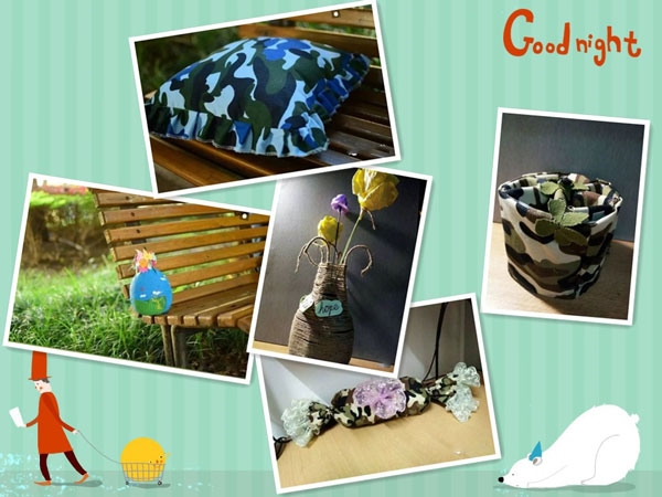1、学生对军训后的迷彩服、帽子、水壶创意大改造