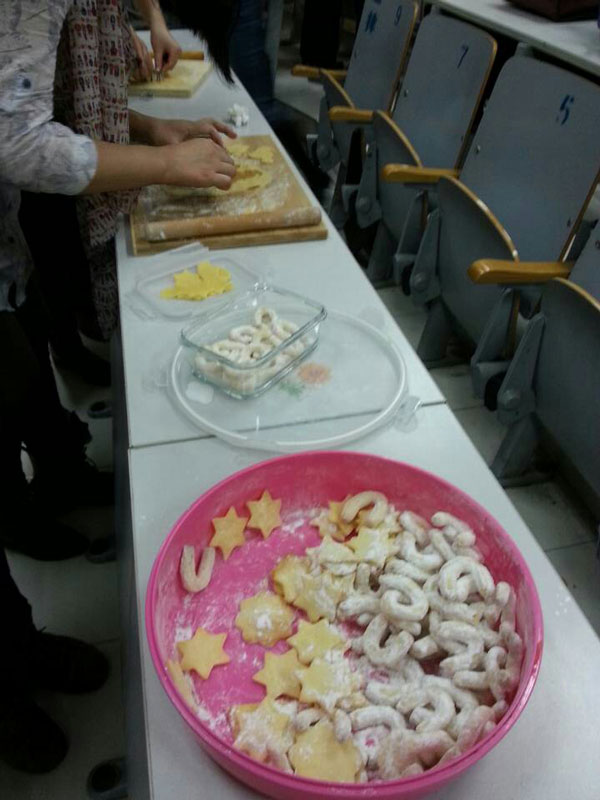 12月22日下午,一场气氛欢快的德语圣诞派对在北京语言大学培训学院外语部主北158教室隆重举行。德语外教Maria、Charlotte、中教佟文斌老师与德语秋季周末班的同学一起烘焙德式饼干、唱歌做游戏、煮制德国热酒等,师生共同庆祝圣诞节。期间佟文斌老师还为大家生动地讲解了德国圣诞习俗。学生们通过学烘焙、饮热酒、唱圣诞歌、做游戏,不仅度过一个欢乐的圣诞节,而且还充分的了解了德国文化。继此次圣诞派对之后,本周23日和25日晚,德语晚班的学生们也将享受到这样集视、听、味觉于一体的圣诞盛宴。