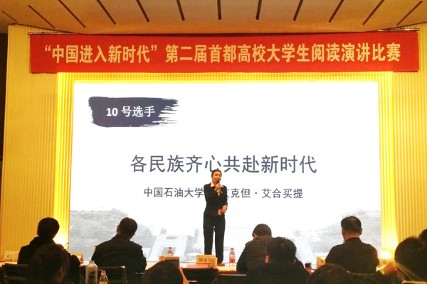 12月26日,由北京市委教育工委主办的“中国进入新时代”首都高校大学生阅读演讲比赛在首都师范大学举行。中国石油大学学习宣传贯彻十九大精神学生宣讲团成员、理学院2015级本科生艾克但·艾合买提经过层层选拔,以出色的表现荣获大赛三等奖,并为石大学生赢得专业成长阅读书籍50册。