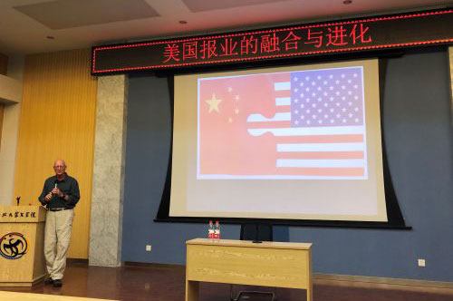 5月27日下午,美国北卡罗来纳大学教堂山分校传媒与新闻学院社区媒体中心主任Jock Lauterer教授为师生作了题为“美国报业的融合与进化”的学术报告。新闻传播学院百余名师生听取了报告。报告由新闻传播学院来向武教授主持,董海滨副教授全程翻译。