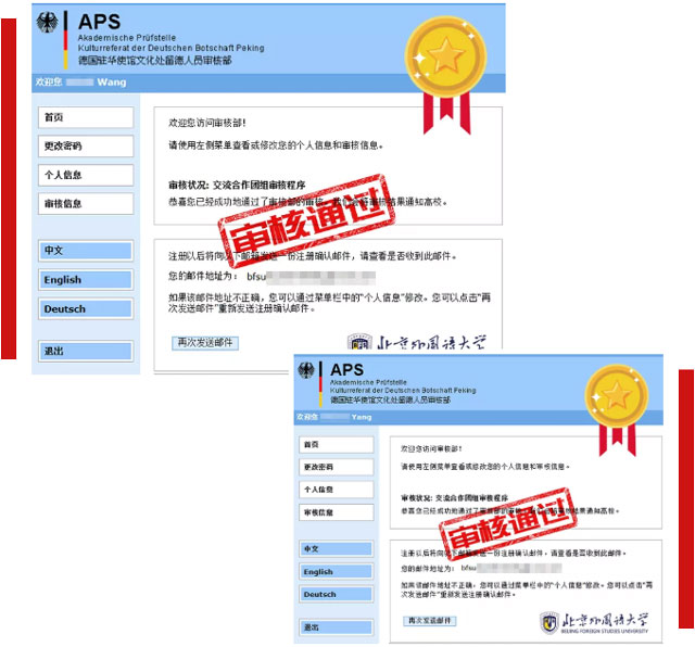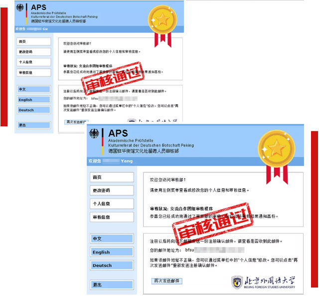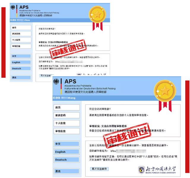 今日下午,北京外国语大学出国留学培训基地德国预科中心收到了同学们的好消息,参加2019年10月26日德适考试的同学收到APS审核部发来的邮件,结果都是——通过审核!!!