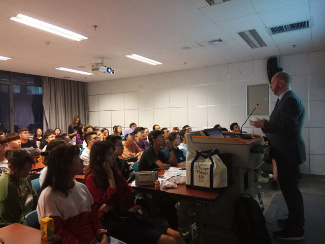 Mr. Martin HOOKMAN登上讲台,做了简短的自我介绍后,开始为大家介绍萨塞克斯大学的地理位置、住宿条件、院校排名以及热门专业的入学要求,同学们听的津津有味!