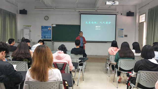 呆萌的企鹅、白茫茫的冰山等,康教授侃侃而谈。同时还分享他在航程中拍摄的有趣画面,调皮的大鲸鱼在围着轮船嬉戏,后续谈到参观了我国在南极的科考站。康教授动情而又不失幽默的讲述激发了同学们对南极充满了兴趣。
