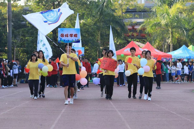 中山大学新华学院2019年校运会于11月27日在东莞校区举行。首次参加校运会的国际学院同学们倍感兴奋,他们身着统一的黄色T恤,挥动着手上的彩色气球,在院旗和院牌的引导下,迈步进入体育场。矫健的身姿展现了国际学院同学们的自信。