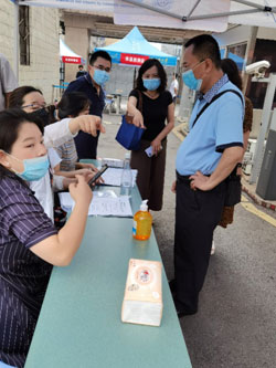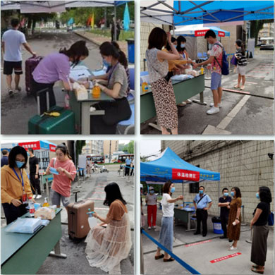 现场设置了5个区域,分别是体温监测区、留观等候区、登记流调区、学生咨询区和行李邮寄区,每个区域均设置了1米间隔线,并配备了纸巾、消毒液、一次性口罩等防疫物资,以及藿香正气液、矿泉水等消暑防暑品。入校学生首先接受体温检测和防疫消杀,并接受流行病学调查,无异常的学生按照流程办理离校手续,有异常的学生则进入留观等候区等待复测,复测无异常后进入离校手续办理流程。为了保障结业学生健康安全返校,学院早规划早部署,提前开展结业生返校演练,李永强副校长和学院领导班子全程参与演练,并提出指导意见。