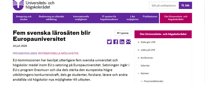瑞典高教署向新入选“欧盟较佳大学”的林奈大学等表示祝贺。这五所大学,均是北京理工大学北欧项目合作多年的瑞典高校,在国际上享有很高的声誉。令人欣慰的是,加上之前就被评为“欧盟较佳大学”的六家瑞典大学:哥德堡大学,斯德哥尔摩经济学院,瑞典皇家理工学院,林雪平大学,隆德大学和斯德哥尔摩大学,现在瑞典共有11所高等教育机构被归入欧洲大学。获得欧盟直接资助意味着,在提高高等教育质量的同时,学生和员工都将获得新的机会进行国际化和交流。