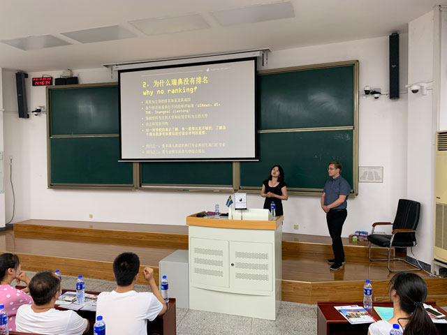 延雪平大学今年派来参加项目说明会的杨丽老师和Timo教授,采用了双人组合的方式,用中英文双语对为什么要去瑞典,为什么要去延雪平大学,为什么要在延雪平城市生活等问题做了详细讲解。两人对延雪平大学学院设置、英文授课专业分布,以及在延雪平城市的学习和生活情况作了详细介绍,并在会后和与会家长及同学做了深入沟通。