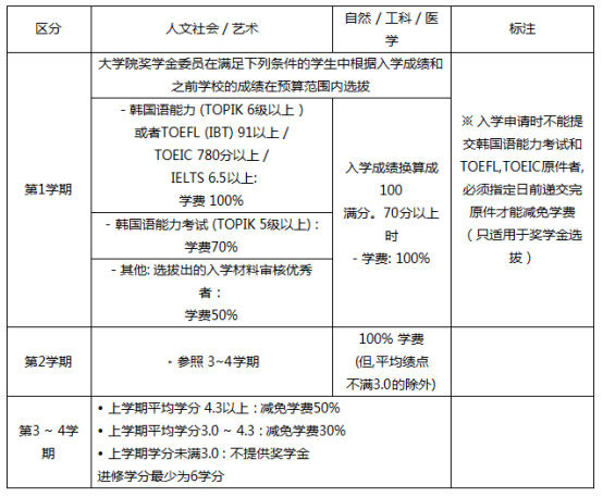 入学金奖学金:就读本校国际教育院两个学期以上的学生中,成绩较高的两个学期的平均分达到70分以上,且平均出勤率80%以上者 免除外国人留学生宿舍费