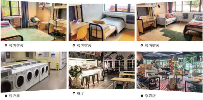 住校内宿舍有単人间和双人间。宿舍设有丰富公共设施,如浴室、餐厅、洗衣间、运动设施、书房、食品储藏室、杂货店等,租金为毎年30美元-75美元(不含生活费)。