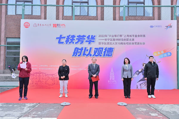 校党委副书记应培礼在运动会开幕式上致辞,欢迎大家前来参与此次活动。为了让大家提前了解规则,我校射艺队首先进行了表演,随之上海市射箭队进行了射箭反曲弓混合团体对抗赛,激发大家参与热情。