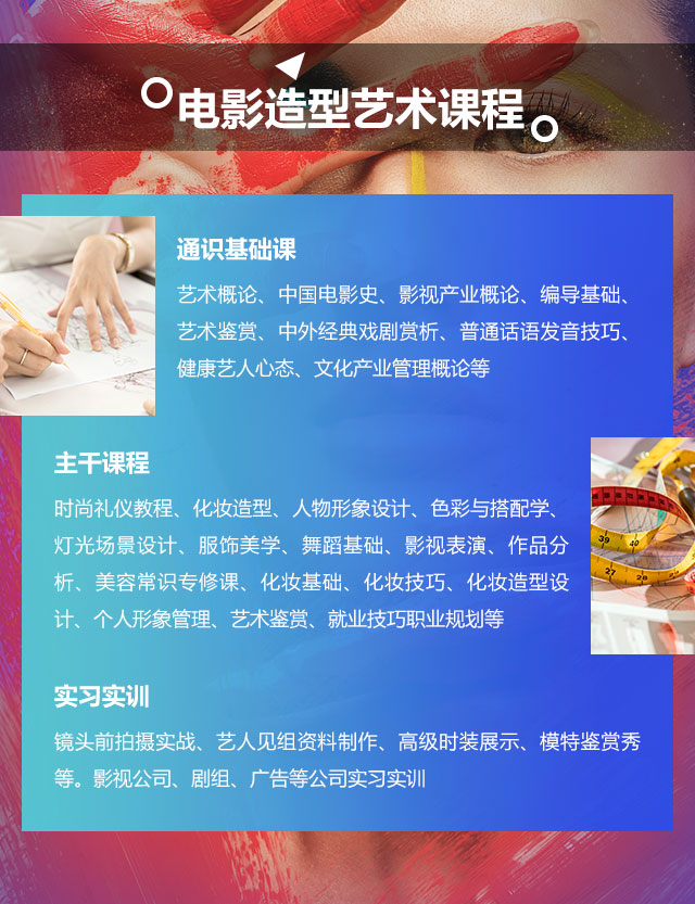 掌握发型设计、化妆设计、服装搭配设计等专业技能,具备人物形象的整体设计,以及舞台影视化妆造型设计能力,从事形象设计或营销工作的高素质技术技能人才。